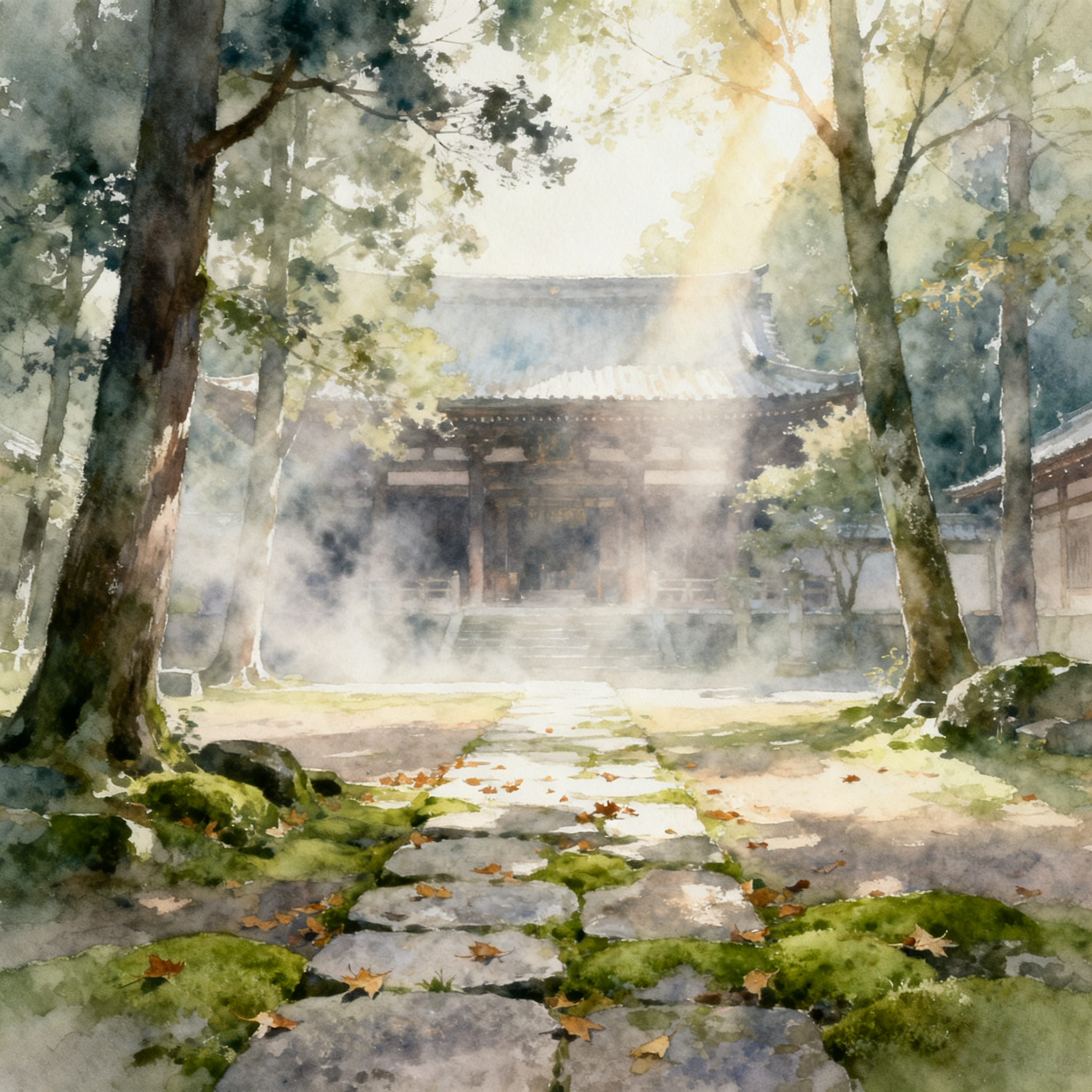 A quiet early morning scene in a traditional Japanese temple courtyard. No peopl